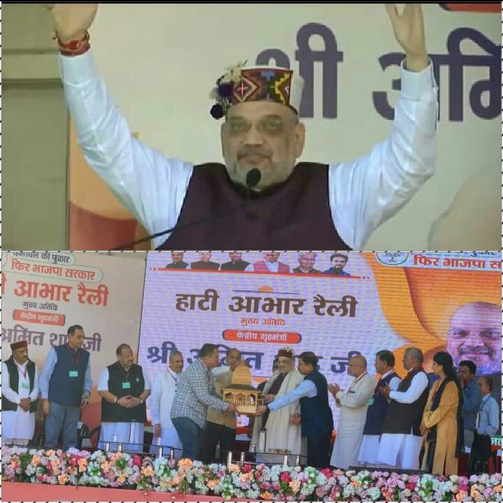 केंद्रीय गृह मंत्री अमित शाह ने शनिवार को सिरमौर के सतौन में आयोजित हाटी आभार रैली में कहा कि केंद्र सरकार द्वारा हाटी समुदाय को जनजातीय दर्जा दिए जाने के बाद कांग्रेस नेता अनुसूचित जाति वालों का आरक्षण चले जाने का भ्रम फैलाने लगे शाह ने उपस्थित जनसमूह को विश्वास दिलाते हुए कहा कि मैं लिखकर देता हूँ यहां की अनुसूचित जाति के हक सुरक्षित रहेंगे । शाह ने कहा कि पूरे देश में अब राजा रानी का राज खत्म हो चुका है, लोकतंत्र में कोई राजा नहीं , सिर्फ जनता राज करती है । शाह ने कहा कि जयराम ठाकुर इस मुद्दे को लेकर उनसे कई बार मिले और इस मांग को पूरा करके ही दिखाया । केंद्र की मोदी सरकार ने हाटी समुदाय की 55 वर्ष पुरानी मांग को एक झटके में पूरा कर दिया । शाह ने कहा सरकार रिपीट करने के रिवाज के लिए इस बार दो-तीन सीटें नहीं बल्कि पूरा सिरमौर चाहिए ।