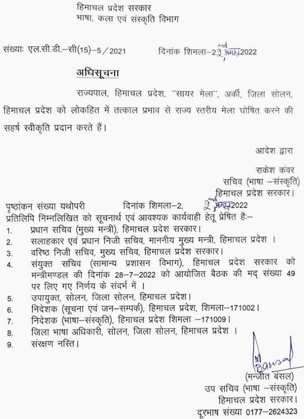 चंबा के ऐतिहासिक मिंजर मेले को अंतराष्ट्रीय मेला घोषित किए जाने के बाद अब जिला सोलन की अर्की तहसील के प्रसिद्ध सायर मेले को राज्यस्तरीय मेला घोषित कर दिया है । मंगलवार को हिमाचल प्रदेश के राज्यपाल ने इस संबंध में अपनी स्वीकृति प्रदान कर दी है ।