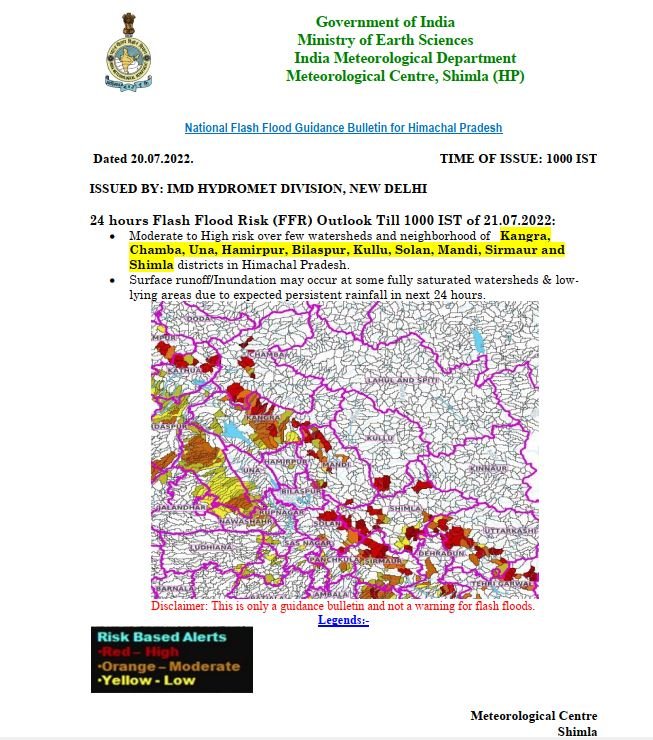 आगामी 24 घण्टों में हिमाचल के कांगड़ा, चंबा, हमीरपुर, बिलासपुर, कुल्लू, सोलन, मंडी, सिरमौर और शिमला में बाढ़ आने की चेतावनी, नदी नालों से दूर रहने की सलाह