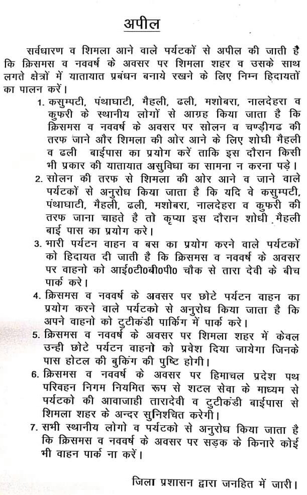 उपायुक्त शिमला ने क्रिसमस व नववर्ष के अवसर पर शिमला आने वाले पर्यटकों से यातायात प्रबंधन के लिए बनाए गए नियमों की अनुपालना किए जाने की अपील की है ।