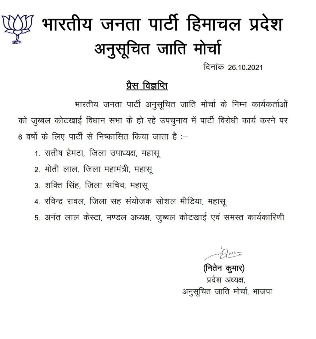 जुब्बल कोटखाई विधानसभा उप चुनाव में पार्टी विरोधी गतिविधियों के फलस्वरूप भारतीय जनता पार्टी अनुसूचित जाति मोर्चा ने 5 कार्यकर्ताओं को 6 वर्षों के लिए पार्टी से किया निष्कासित ।