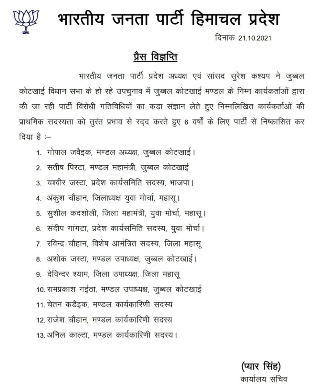 जुब्बल-कोटखाई विधानसभा क्षेत्र में पार्टी विरोधी गतिविधियां करने पर भाजपा प्रदेश अध्यक्ष सुरेश कश्यप ने मंडल अध्यक्ष समेत 13 लोगों को 6 सालों के लिए दिखाया पार्टी से बाहर का रास्ता