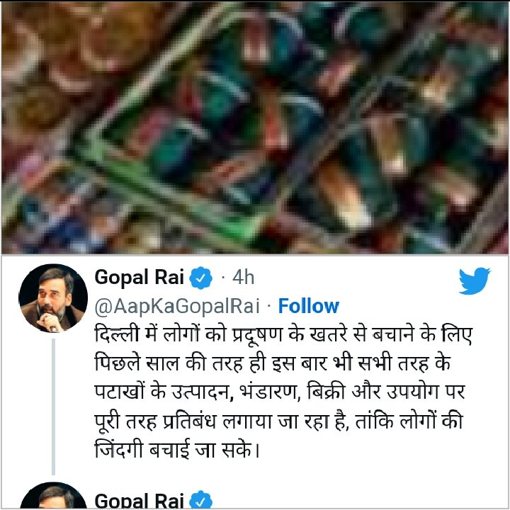 दिल्ली की आप सरकार के पर्यावरण मंत्री गोपाल राय ने ट्वीट कर कहा है कि इस वर्ष भी पर्यावरण प्रदूषण को देखते हुए दिल्ली सरकार ने पटाखों की बिक्री और इस्तेमाल पर 1 जनवरी 2023 तक पूरी तरह से बैन लगा दिया है ।