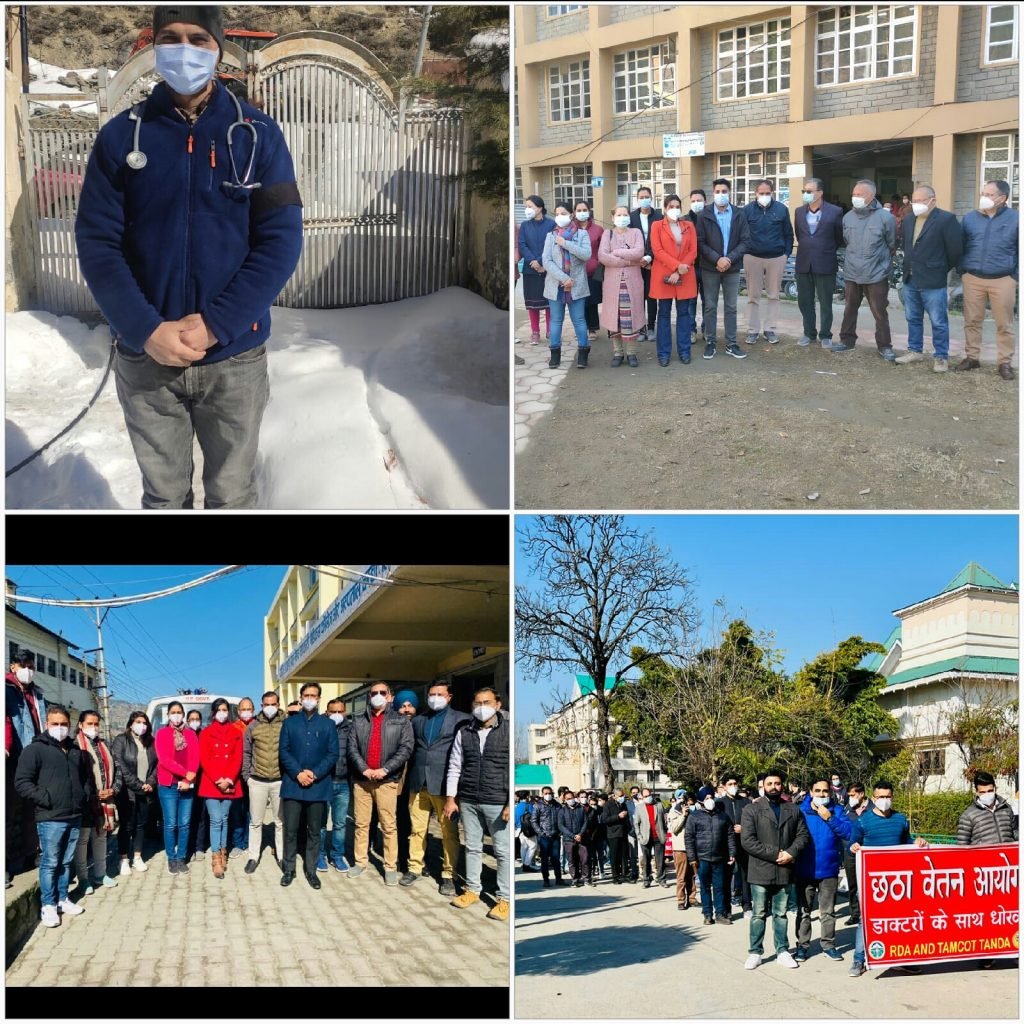 प्रदेश भर के चिकित्सकों ने आज पूरे प्रदेश में अपने संघर्ष का बिगुल बजाते हुए सुबह 9:30 बजे से लेकर 11:30 बजे तक प्रदेश के सभी स्वास्थ्य संस्थानों, मेडिकल कॉलेज में 2 घंटे पेन डाउन स्ट्राइक की शुरुआत कर अपना रोष जाहिर किया । हिमाचल प्रदेश मेडिकल ऑफिसर एसोसिएशन महासचिव डॉ पुष्पेंद्र वर्मा ने बताया कि हमारी मुख्य मांगों में प्रदेश में डॉक्टरों के लिए पंजाब वेतनमान को अक्षरश लागू करने,बेसिक प्लस एनपीए की अधिकतम सीमा को पंजाब की तर्ज पर 237600 किए जाने व नए अनुबंधित चिकित्सको को एंट्री लेवल का वेतन 56100 प्लस एनपीए प्रदान किया जाना शामिल है। इसके साथ ही प्रदेश में चिकित्सकों के लिए 4-9-14 के टाइम स्केल को फिर से लागू किया जाना चाहिए और चिकित्सकों के एनपीए को जो कि 25 से 20% किया गया है उसको 1/1/ 16 से ना लागू करते हुए 3 जनवरी 2022 से लागू किया जाना चाहिए। चिकित्सकों के वेतन की गणना के लिए केंद्र सरकार की तर्ज पर एक गुणांक टेबल जारी किया जाना चाहिए ताकि किसी के भी वेतन में किसी भी तरह की कोई विसंगती पैदा होने का सवाल उत्पन्न ना हो।