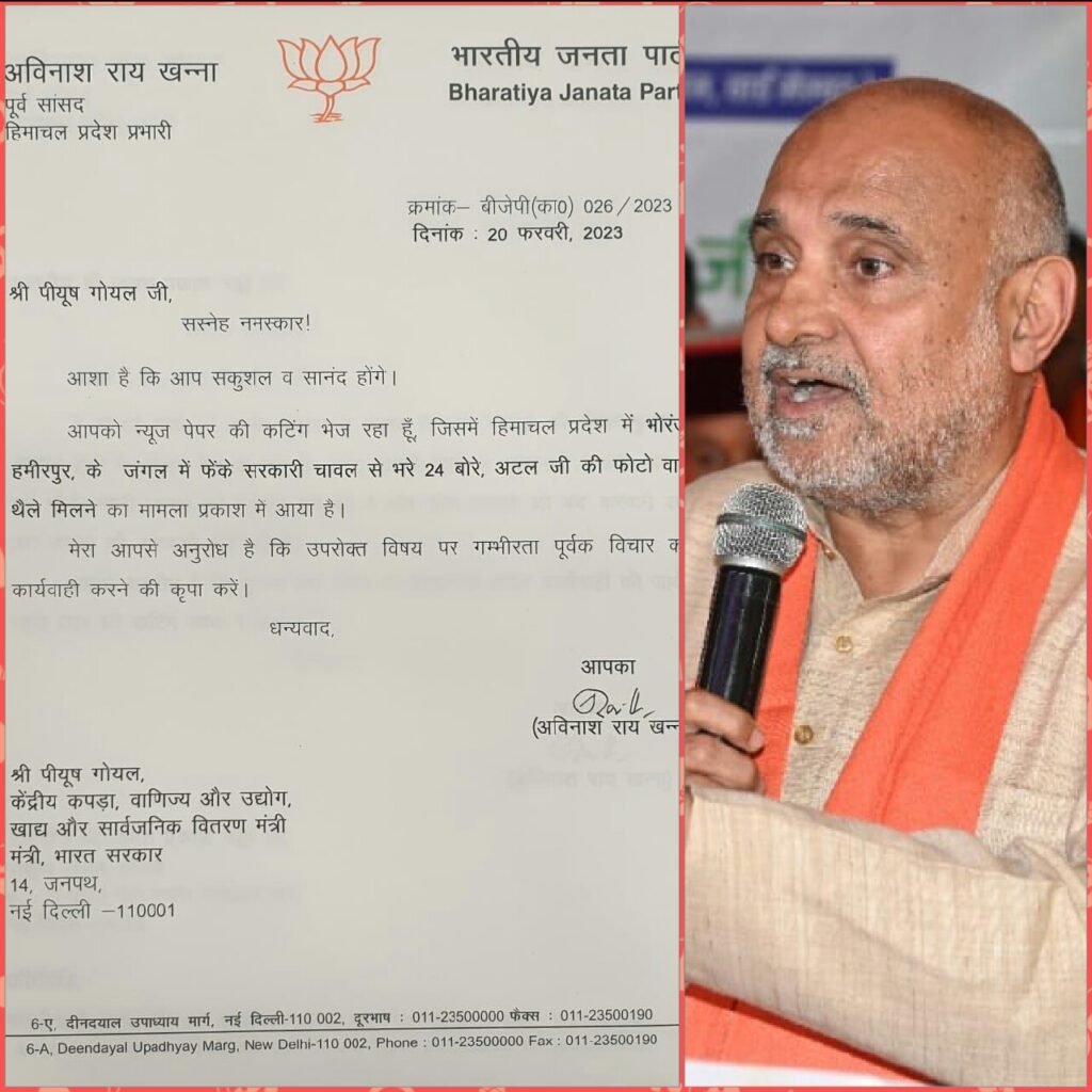 पत्र में अविनाश राय खन्ना ने पीयूष गोयल को अवगत करवाया कि भोरंज विधानसभा क्षेत्र जिला हमीरपुर के जंगल में फेंके सरकारी चावल से भरे 24 बोरी जिनपर पूर्व प्रधानमंत्री अटल बिहारी वाजपेई जी की फोटो लगी थी उसका मामला सामने आया है।
