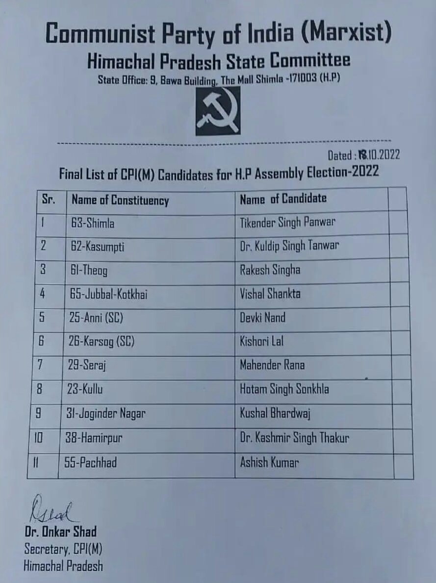 Himachal माकपा ने हिमाचल विधानसभा चुनाव के लिए अपने 11 उम्मीदवारों की सूची की जारी HimachalSatyaNews October 18, 2022 माकपा ने हिमाचल विधानसभा चुनाव के लिए अपने 11 उम्मीदवारों की सूची की जारी। Post navigation Previous कांग्रेस ने हिमाचल विधानसभा चुनाव के लिए अपने 46 उम्मीदवारों की सूची की जारीNext भाजपा ने हिमाचल विधानसभा चुनाव के लिए अपने 62 उम्मीदवारों की सूची की जारी Leave a Reply Cancel replyYour email address will not be published. Required fields are marked *Comment * Name * Email * Website Save my name, email, and website in this browser for the next time I comment. More Stories Himachal Shimla बीपीएल सूची के नाम काटना, गरीबों को योजनाओं से बाहर करने का संगठित षड्यंत्र : राकेश जमवाल January 4, 2026 HimachalSatyaNews Himachal Shimla मंडी से ऊना तक चलेगा जनजागरण अभियान, वरिष्ठ नेता करेंगे प्रेस वार्ताओं को संबोधित : भाजपा January 4, 2026 HimachalSatyaNews Himachal Kangra मुख्यमंत्री ने राजकीय महाविद्यालय धर्मशाला की मृतक छात्रा के परिजनों को ढांढस बंधाया, दोषियों के खिलाफ की जाएगी कड़ी कार्रवाई का दिया आश्वासन January 4, 2026 HimachalSatyaNews