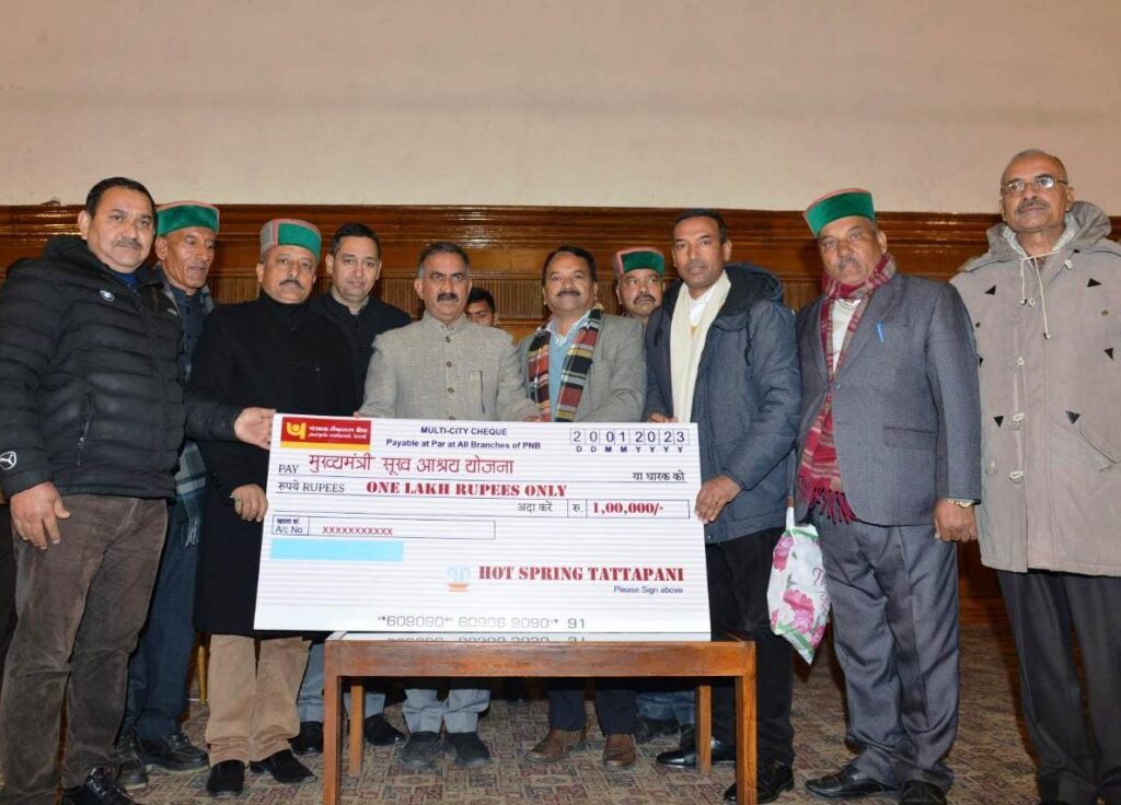 मुख्यमंत्री ठाकुर सुखविंदर सिंह सुक्खू को आज यहां होटल हॉट स्प्रिंग ततापानी के प्रबन्ध निदेशक प्रेम रैणा तथा नगर परिषद् सुन्नी के अध्यक्ष प्रदीप शर्मा ने मुख्यमंत्री सुखाश्रय सहायता कोष के लिए एक लाख रुपये का चेक भेंट किया।