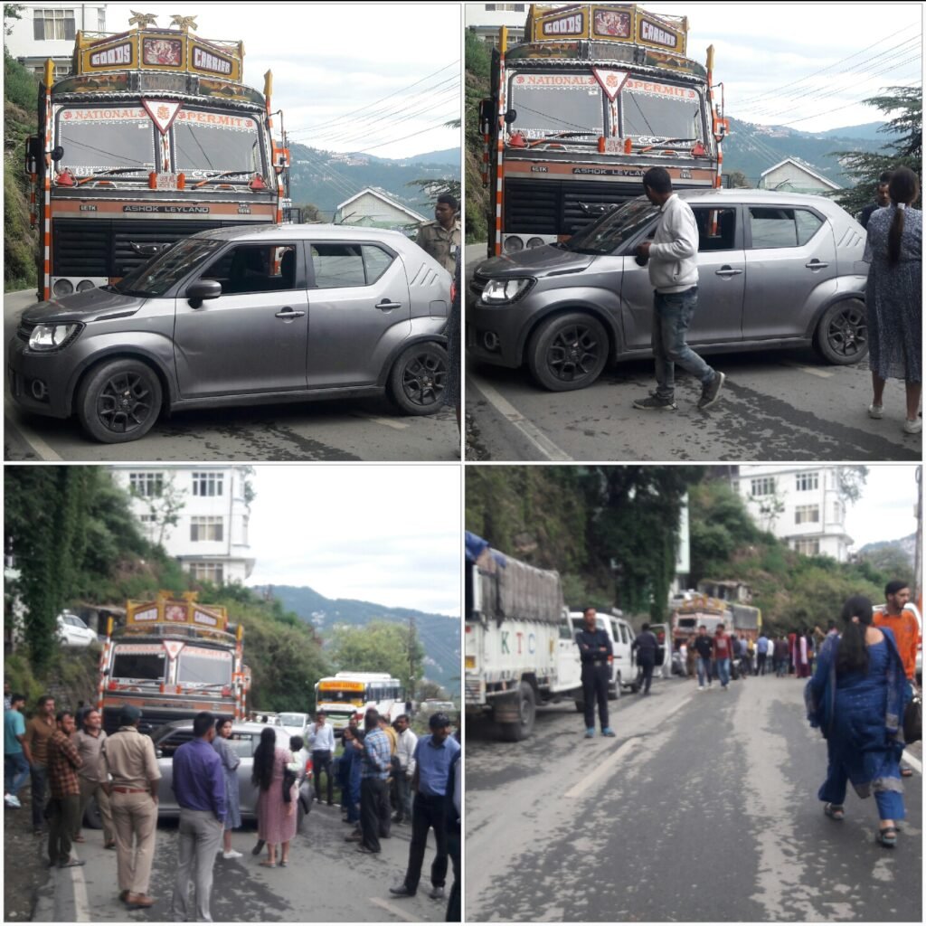 शिमला के चक्कर में ट्रक ने हरियाणा की कार को मारी टक्कर, ओवरटेक करते वक्त हुई दुर्घटना, रोड़ ब्लॉक होने से यात्रियों को झेलनी पड़ी परेशानी