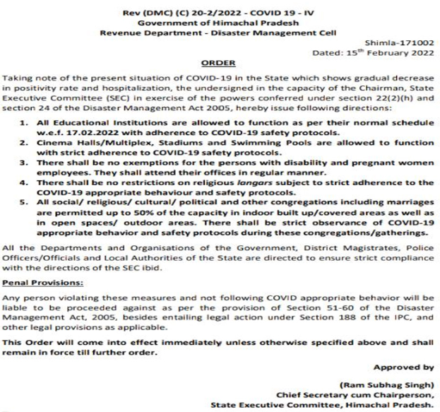 हिमाचल प्रदेश में 17 फरवरी से सभी शिक्षण संस्थानों को खोलने की अनुमति के बाद स्कूलों में कोविड नियमों की सख्त नियमों की अनुपालना को तय कर दिया गया है । इस संबंध में आपदा प्रबंधन व शोक्षा विभाग ने एस ओ पी जारी कर दी है ।