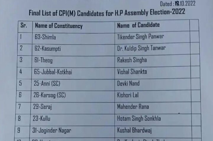माकपा ने हिमाचल विधानसभा चुनाव के लिए अपने 11 उम्मीदवारों की सूची की जारी।