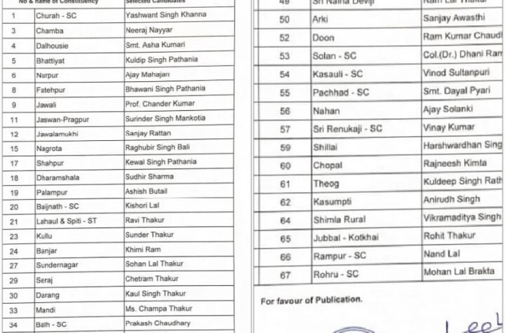 कांग्रेस ने हिमाचल विधानसभा चुनाव के लिए अपने 46 उम्मीदवारों की सूची की जारी