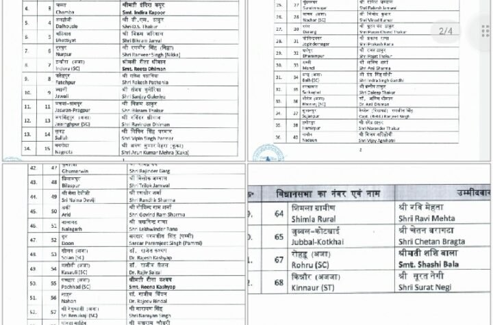 शिमला भाजपा ने हिमाचल विधानसभा चुनाव के लिए अपने 62 उम्मीदवारों की सूची जारी...