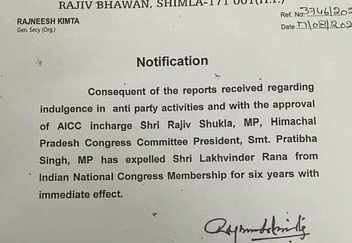 शिमला कॉन्ग्रेस ने अपने दो वरिष्ठ बागी नेताओं कांगड़ा से कांग्रेस विधायक पवन काजल...