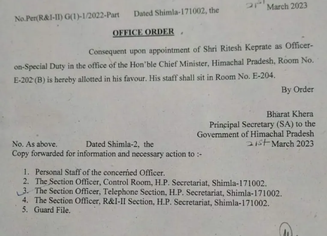 शिमला रितेश कपरेट को मुख्यमंत्री सुखविंद्र सिंह सुक्खू का ओएसडी लगाया गया है ।