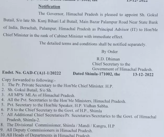 शिमला गोकुल बुटेल को मुख्यमंत्री का प्रधान सलाहकार (सूचना प्रौद्योगिकी एवं नवाचार) नियुक्त किया...