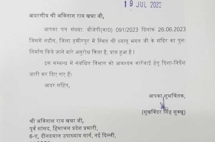 शिमला भाजपा प्रभारी अविनाश राय खन्ना ने मुख्यमंत्री सुखविंदर सिंह सुक्खू को 26 जून...