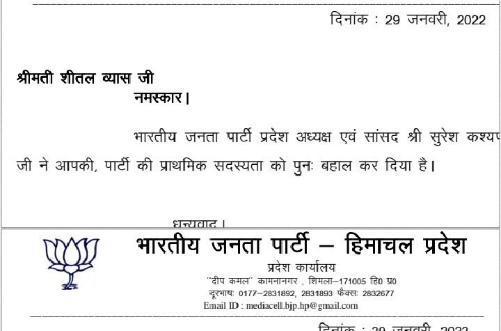 शिमला भारतीय जनता पार्टी प्रदेश अध्यक्ष सुरेश कश्यप ने जिला कुल्लू से अर्चना ठाकुर...