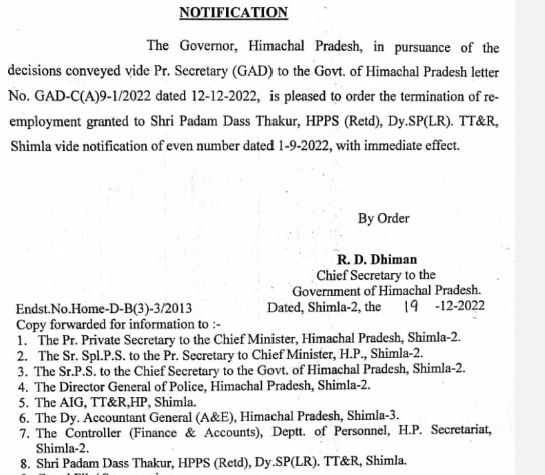 शिमला डीएसपी पदम् ठाकुर का सेवा विस्तार सरकार ने किया रद्द।