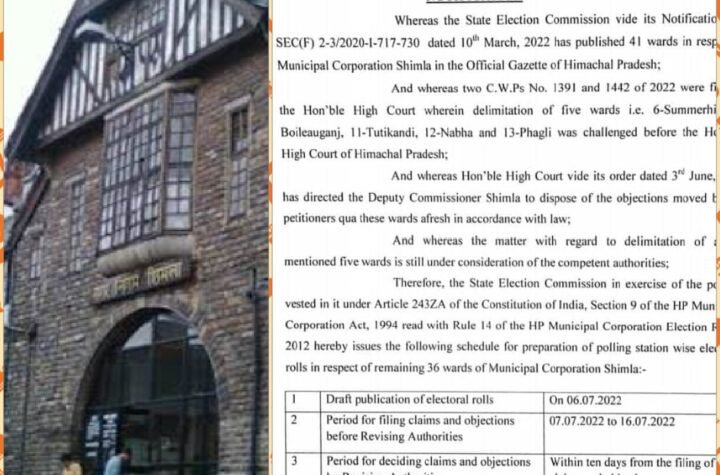 Shimla राज्य चुनाव आयोग ने नगर निगम शिमला चुनावों के लिए 6 जुलाई को 36 वार्डों की वोटर लिस्ट ड्राफ्ट जारी करने के दिए निर्देश July 5, 2022 HimachalSatyaNews शिमला नगर निगम शिमला के चुनाव की तैयारियां आरम्भ हो गई हैं । एम...